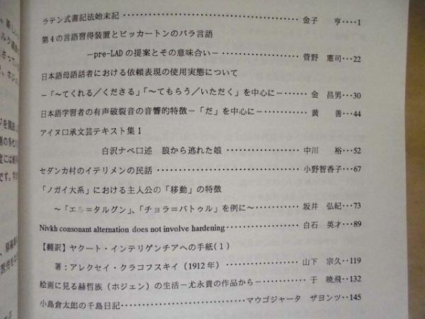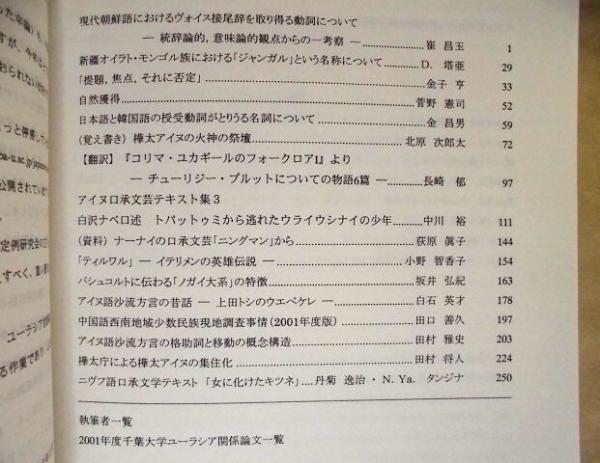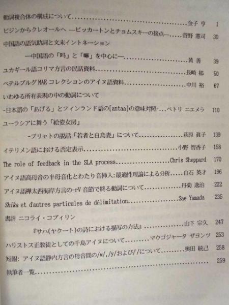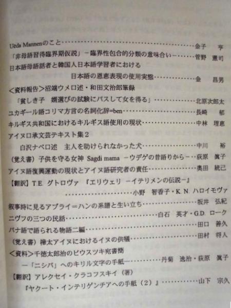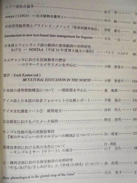 • 著者 「目次」より一部抜粋:・ユカギール語コリマ方言の民話資料 ・ペテルブルグMAEコレクションのアイヌ語資料 ・(第2号)金子亨先生退官記念号 ・ニブフ語抱合論争 ・モンゴル民族の鳥の英雄叙事詩『雀のテルジェーの子スルジェーの物語』について ・セダンカ村のイテリメンの民話 ・小島倉太郎の千島日記 ・キルギス共和国におけるキルギス語使用の現状 ・樺太アイヌにおけるイヌの供犠 ・樺太アイヌの火神の祭壇 ・アイヌ語沙流方言の昔話 ・モンゴルにおける種馬に関する儀礼をめぐって ほか