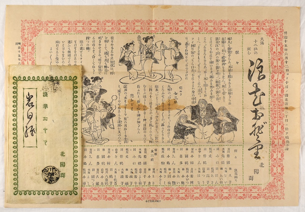 • 解説 〈状態〉経年並上 少シミ 〈内容〉内題「天満十二社の賑ひ 浪花おどり 北陽群」 「明治十五年六月十二日ヨリ十日ノ間北新地二丁目ニ於テ晴雨不論」 袋付 28.5×41.5cm