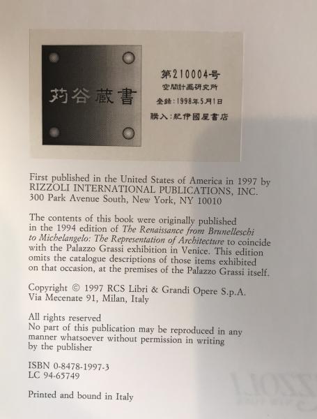 • 解説 Large-format hardcover with dust jacket in Excellent condition (Rank A). The decisive feature is the Japanese provenance stamp on the colophon page, reading “Akutaya Zōsho” and “Kukan Keikaku Kenkyūsho,” with notes “Registered May 1, 1998” and “Purchased: Kinokuniya Bookstore,” confirming association with the institute linked to Kenzo Tange. This provides a rare, traceable provenance connecting Renaissance architectural scholarship to a major figure of 20th-century Modernism. Clean page edges and interior with no visible foxing. A highly desirable, museum-level reference for architectural history collections, research libraries, and specialists in Tange’s intellectual legacy.