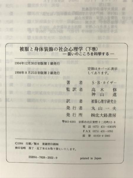 被服と身体装飾の社会心理学 (下巻): 装いのこころを科学する 北大路書房 S.B. カイザー