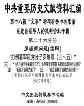 v. 27.罗瑞卿问题(续五) 1、“四海翻腾·第七期-批斗罗瑞卿大会纪实”(海军直属机关“红联总”·1967年5月30日) 2、“反革命修正主义分子罗瑞卿反动言论一百例”(供内部批判用〉(中国人民解放军总部高等军事学院井冈山革命造反团·1967年7月) 3、“工农兵大批判丛书之六·反党篡军野心家罗瑞卿罪恶史”(首都《史学革命》编辑部·1968年1月)