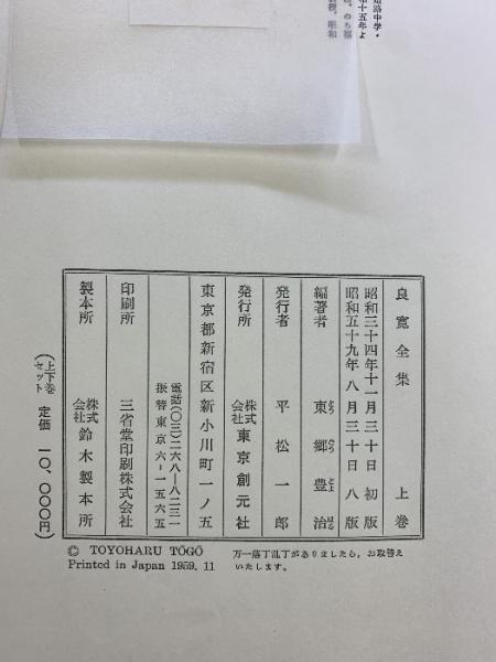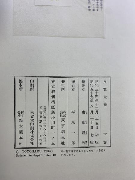 良寛全集(上・下巻/全2冊セット)発行:東京創元社 編著:東郷豊治 昭和59年