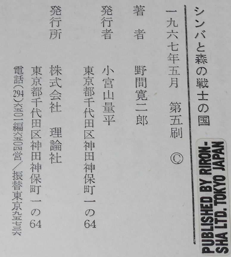 • 解説 ジュニア・ライブラリー シンバと森の戦士の国 野間寛二郎 理論社 1967年5月第5刷 A5判ハードカバー.
