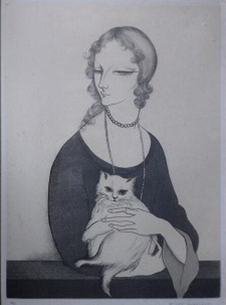 小林ドンゲ銅版画 仮「猫を抱いた婦人」