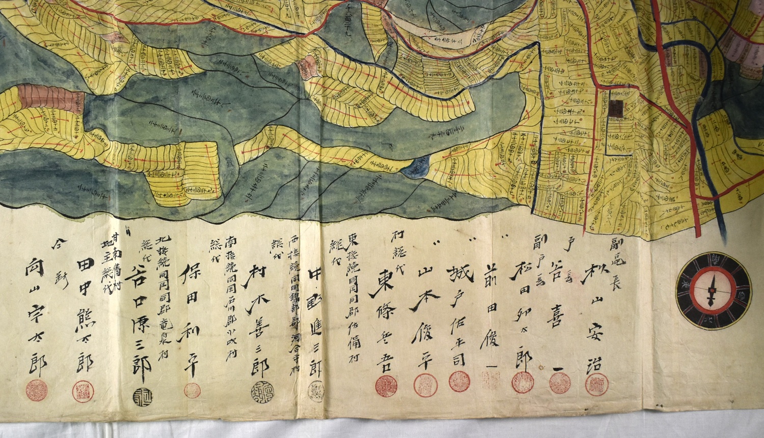 • 解説 〈状態〉良好 〈内容〉「地租改正地引絵図」 副区長、戸長、地主総代、隣接村総代等連署押印 裏打あるも裏打箇所に割印押 131×157cm