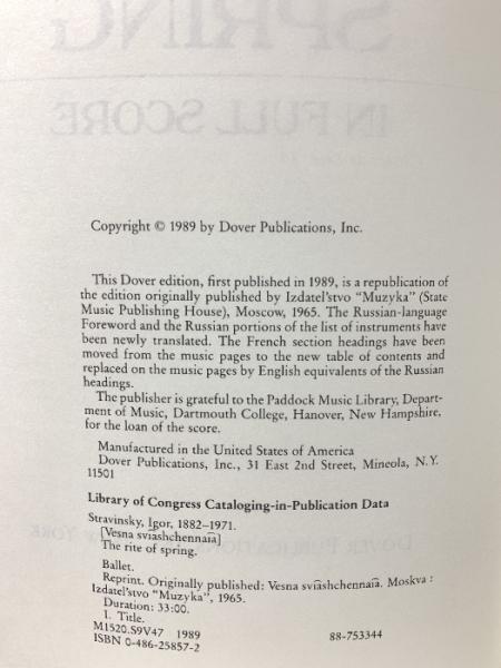 洋書 楽譜 Stravinsky The Rite of Spring in Full Score Dover Publications Igor Stravinsky