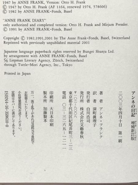 アンネの日記 増補新訂版 文藝春秋 アンネ フランク