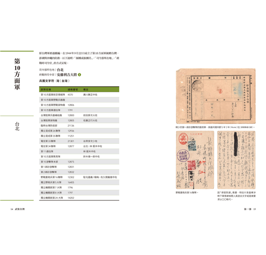 第一部「武裝台灣」彙整出終戰前,日軍配置在台灣各地的駐防部隊、所屬通稱號,並搭配軍郵信件、徵兵文書、匯款單等史料對照,可作為日後相關戰史研究的輔助資料。