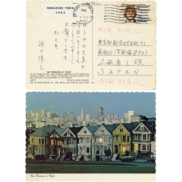 • 解説 新潮社 山崎省三宛 昭和57年元旦 ペン6行 サンフランシスコからの絵葉書 「昨年中は大変お世話になりました ~」