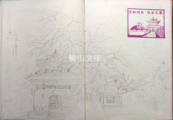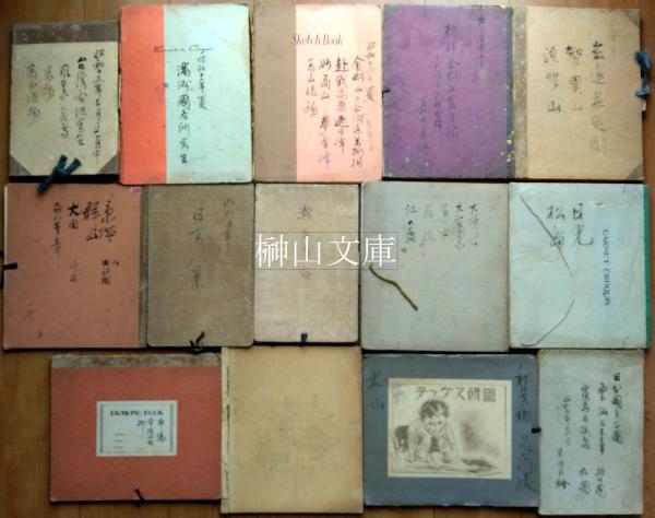 全点が鉛筆描き 名所旧跡・風景・人物・花鳥など画題は様々で、一部に彩色や訪問地記念印有り、ヤケや擦れなど経年による劣化は見られるも状態良好。