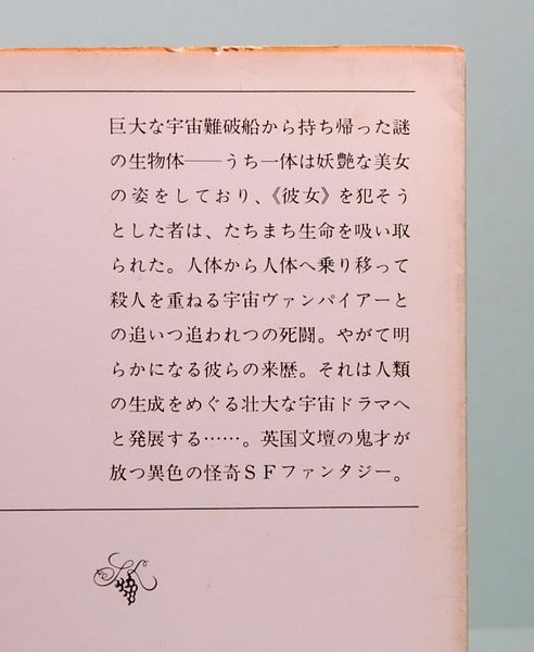 • 解説 【巨大な宇宙難破船から持ち帰った謎の生物体―うち一体は妖艶な美女の姿をしており、<彼女>を犯そうとした者は、たちまち生命を吸い取られた。人体から人体へ乗り移って殺人を重ねる宇宙ヴァンパイアーとの追いつ追われつの死闘。 やがて明らかになる彼らの来歴。それは・・・】文庫サイズ、ソフトカバー、412p、本体:捩じれ有り、三方にヤケと少汚れ有り、本文:少ヤケ有り、カバー:汚れとツカレ有り
