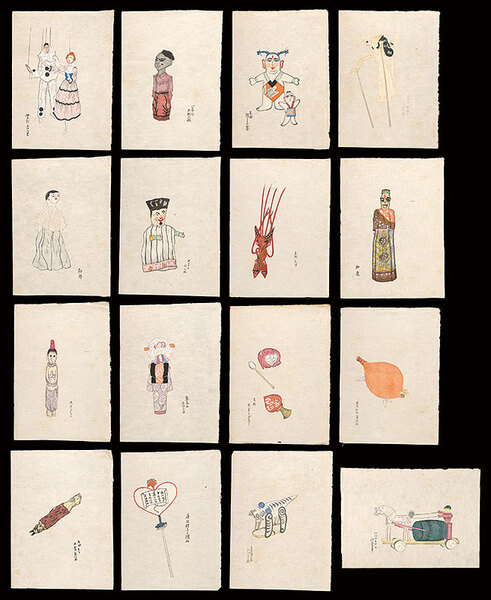 • 解説 木版44×31.5cm(シートサイズ)16枚シミ シワ  ※料治熊太編集の白と黒社より、版芸術、おもちゃ絵集、土俗玩具集など類似の版画集が刊行されている 伊太利 あやつ里 ジャワ 木彫人形 支那 縫くるみ製 ジャバ地方のかげ絵 朝鮮 巴里の指人形 支那天津 印度 ホッテントット 東京のあねさま 支那 木魚とぶりぶり 亜米利加 笛風船 スペイン 木製鳥笛 唐招提寺の団扇 ハバロスクの水売車 台湾産 紙細工の虎
