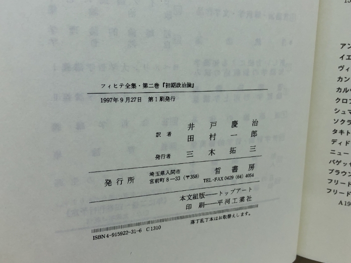 フィヒテ全集 (第2巻) 初期政治論  晢書房 ヨ-ハン・ゴトリ-ブ・フィヒテ