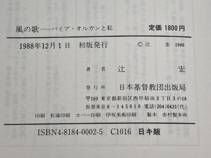 風の歌 パイプオルガンと私 日本基督教出版 辻 宏