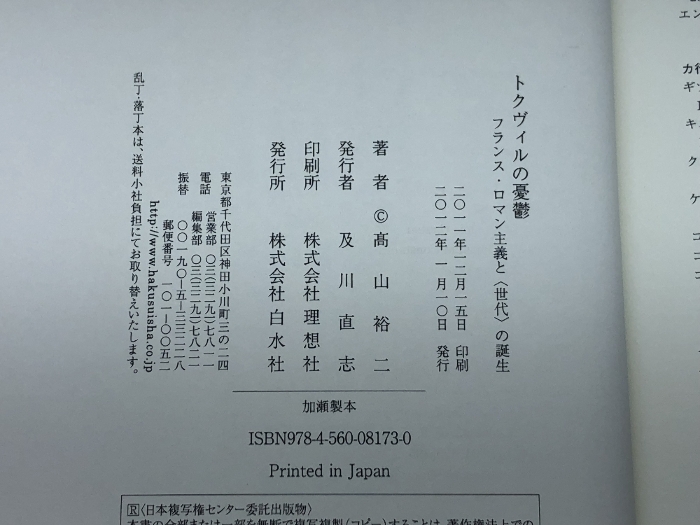 トクヴィルの憂鬱: フランス・ロマン主義と〈世代〉の誕生 白水社 高山 裕二