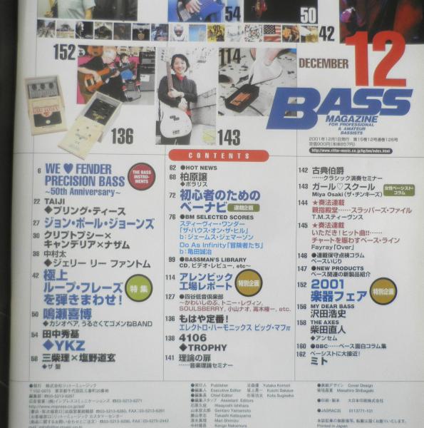 WE LOVE FENDER PRECISION BASS~50th Anniversary~ プリング・ティース ジョン・ポール・ジョーンズ クリプトシー×キャンデリア×ナザム 極上ループ・フレーズを弾きまわせ! 鳴瀬喜博 YKZ 三柴理×塩野道玄 初心者のためのベーナビ アレンビック工場レポート 2001楽器フェア 他
