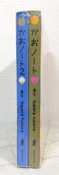 「かおノート」の太陽と「かおノート2」のお花が見つめ合うユーモラスな箱に、「かおノート」と「かおノート2」各1冊、さらにのかおのポストカード1枚とパーツシール1枚のおまけがついています。