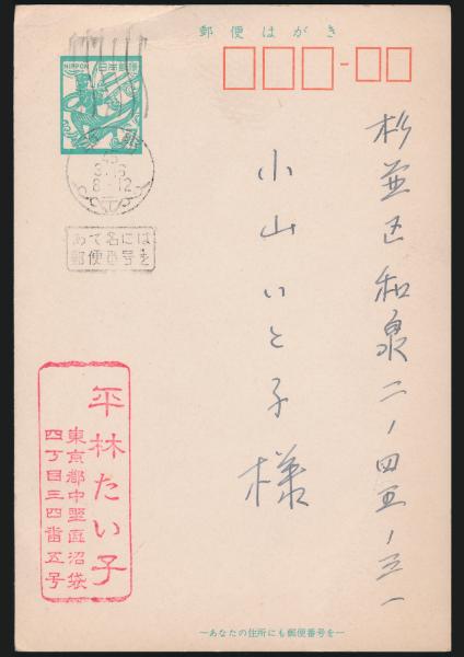 平林たい子葉書 小山いと子宛