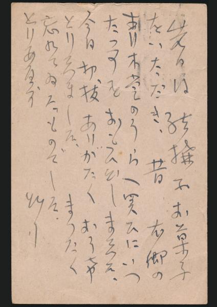 • 解説 【国内送料無料】4月5日付(全集の年代推定によると昭和18年です)、ペン書き8行、上部にわずかに破れがございます。内容はお菓子と切抜きのお礼です。『高村光太郎全集 第14巻』(筑摩書房発行)所収。