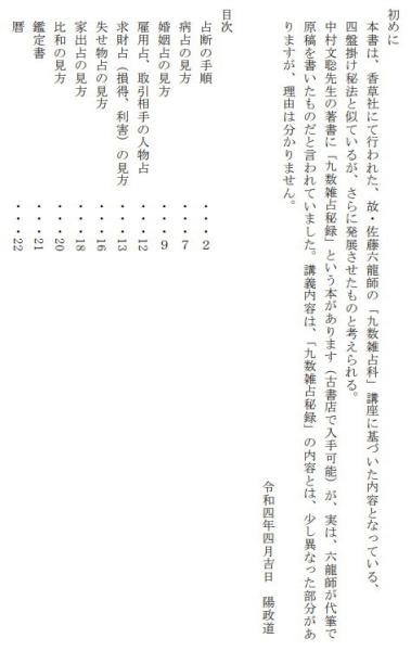 【初めに】本書は、香草社にて行われた、故・佐藤六龍師の「九数雑占科」 講座に基づいた内容となっている、 四盤掛け秘法と似ているが、さらに発展させたものと考えられる。 中村文聡先生の著書に「九数雑占秘録」という本があります(古書店で入手可能)が、実は、六龍師が代筆で 原稿を書いたものだと言われていました。講義内容は、「九数雑占秘録」の内容とは、少し異なった部分がありますが、理由は分かりません。【目次】 ●占断の手順 ●病占の見方 ●婚姻占の見方 ●雇用占、取引相手の人物 ●求財占(損得、利害)の見方 ●失せ物の見方 ●家出占の見方 ●比和の見方 ●鑑定書 ●暦