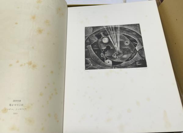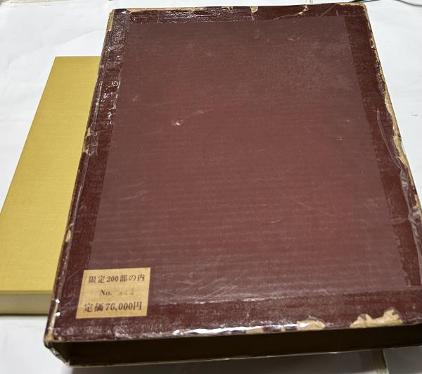 • 解説 限定200部のうち114番、銅版画2点入(ヤケシミ強し、番号、サイン入) 二重箱(輸送箱ヤケ、傷み多くテープ補修 また、輸送箱と中箱の間のダンボールがないので新しくダンボールを1枚挟んである) 本体小口等ヤケシミ 総革装 オフセット・グラビア版56図 銅版画作品カタログに227図 28.5x34.5cm 定価76.000円 昭和48年刊