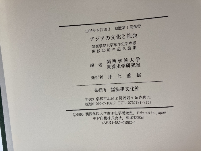 アジアの文化と社会―関西学院大学東洋史学専修開設三十周年記念論集 法律文化社 関西学院大学東洋史学研究室