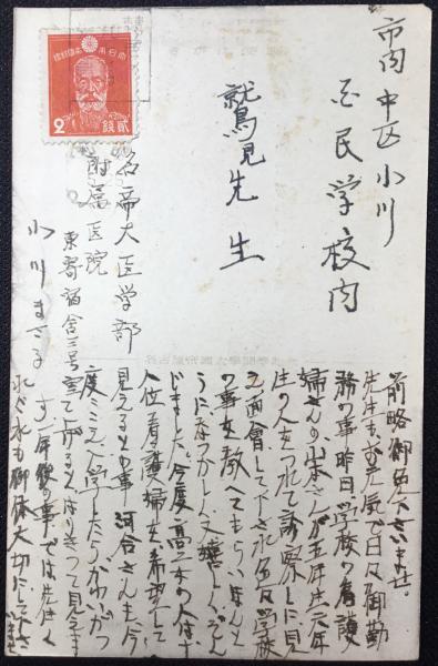 • 解説 1枚 名古屋帝国大学医学部付属病院勤務の看護婦から名古屋市小川国民学校教師への葉書 実逓済 エンタイヤ