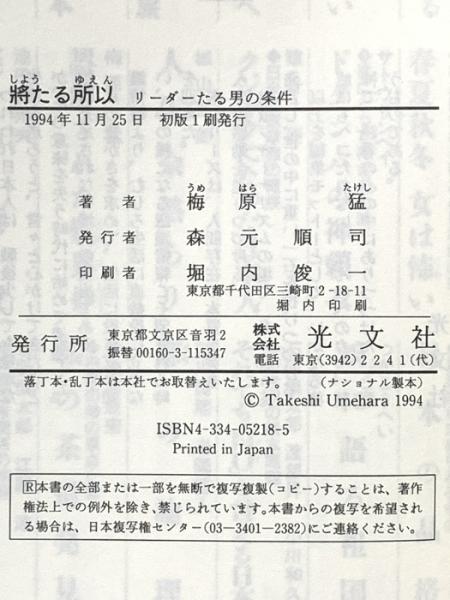 將たる所以: リーダーたる男の条件 (カッパハード) 光文社 梅原 猛