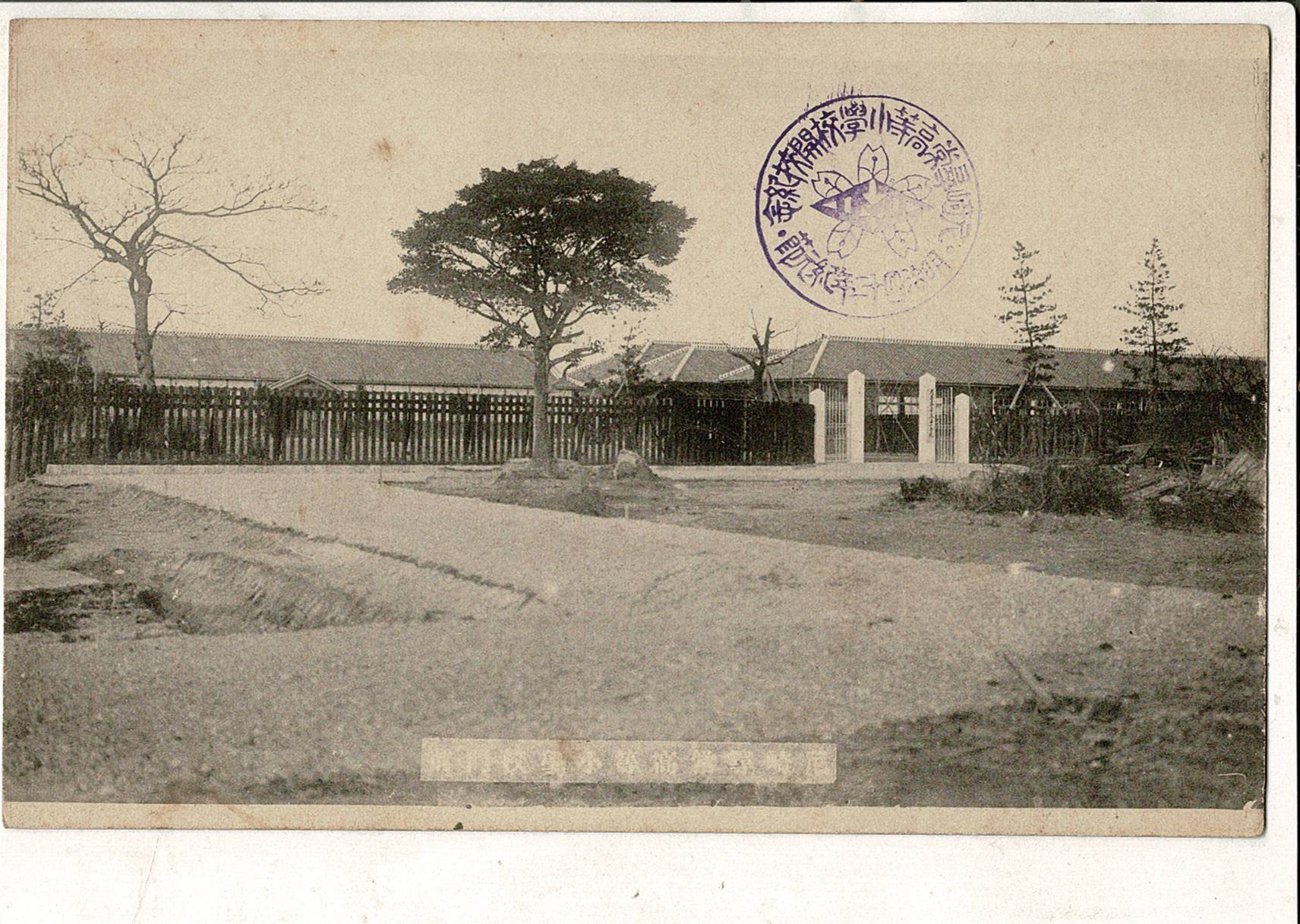 (レトロ絵葉書)「尼崎尋常高等小学校門扉」通信面に「尼崎尋常高等小学校開口紀念・明治四十二年紀元節」印 泉金堂製