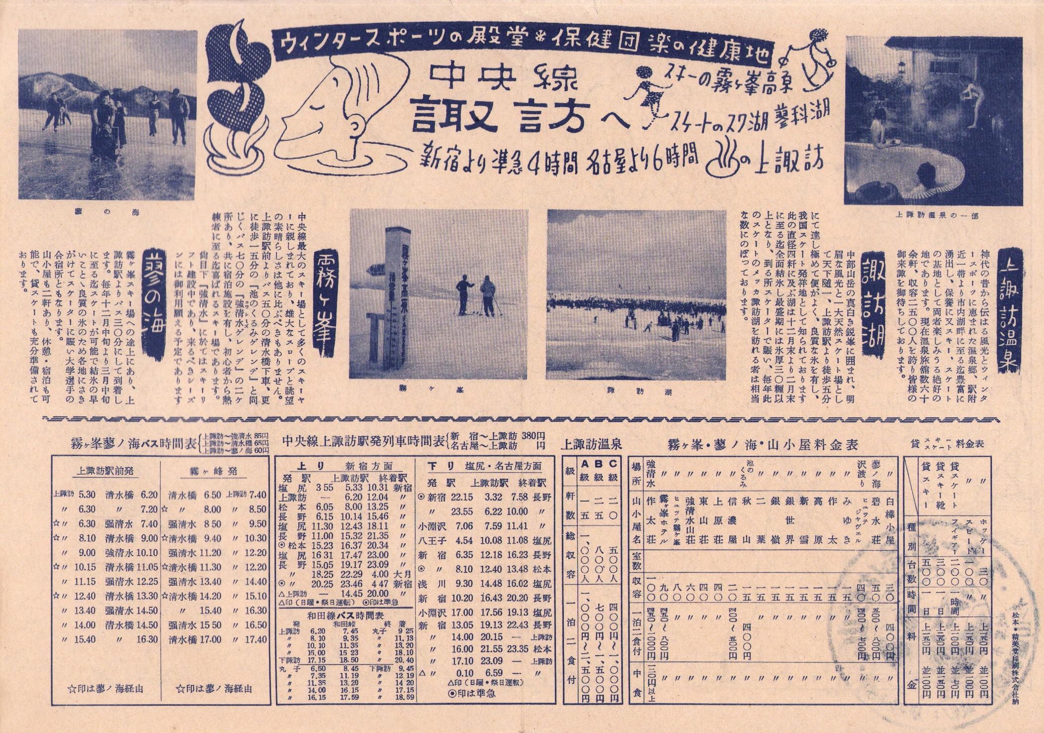 • 解説 *美品、19×27cm、〈おもて バス時間表、列車時間表、山小屋料金表〉〈裏 スキーツアーコース〉、運動具店印