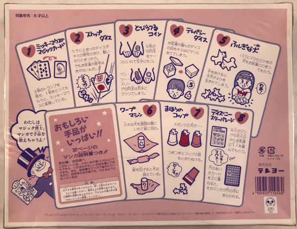 8つの手品:ミッキーマウスのマジックカード、ディズニースターパレード、ストップダイス、テレパシーダイス、とびうつるコイン、ふしぎな犬、ワープマシン、まほうのコップ マンガ説明書付き