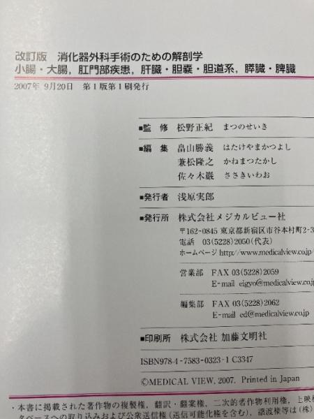 消化器外科手術のための解剖学 -小腸・大腸,肛門部疾患,肝臓・胆嚢・胆道系,膵臓・脾臓 メジカルビュー社 正紀, 松野