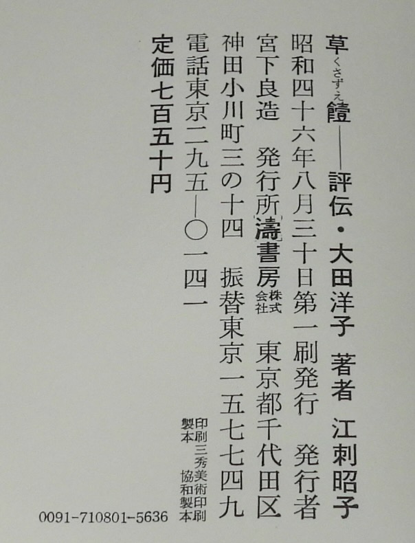 • 解説 草饐 評伝大田洋子 江刺昭子 涛書房 昭和46年8月第1刷 四六判箱入.