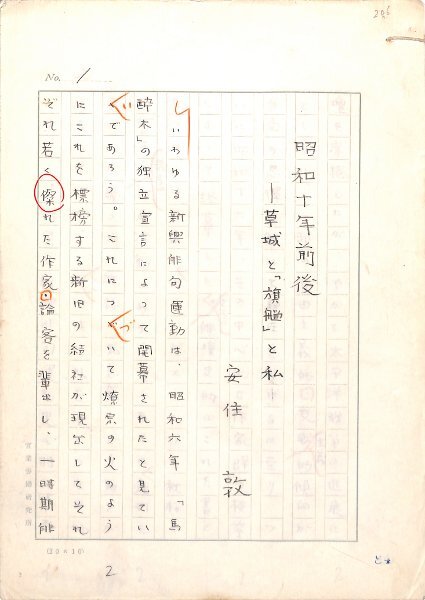 • 解説 『昭和十年前後』草城と「旗鑑」と私 鉛筆 200字詰原稿用紙29枚完 日野草城の「ミヤコ・ホテル」に惹かれて新興俳句運動に加わった作者が、当時の俳壇と時代の流れを回想する。(種別)回想記 #八木書店近代自筆物/1.草稿類 #94号近代文学特輯 code00223 ※自筆物につきましては、毎月25日前後に新蒐品を追加しております。PDF形式で御覧になりたい方は https://company.books-yagi.co.jp/archives/news/10928 を参照ください。