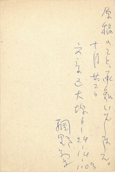 • 解説 風景編集部宛 ペン書 4行 昭46・10・22(消印) 中折 「原稿のこと、承知いたしました」とのみ。(発信地)文京区大塚(受信地)渋谷区鉢山町 #八木書店近代自筆物/3.葉書類 #94号近代文学特輯 code09293 ※自筆物につきましては、毎月25日前後に新蒐品を追加しております。PDF形式で御覧になりたい方は https://company.books-yagi.co.jp/archives/news/10928 を参照ください。