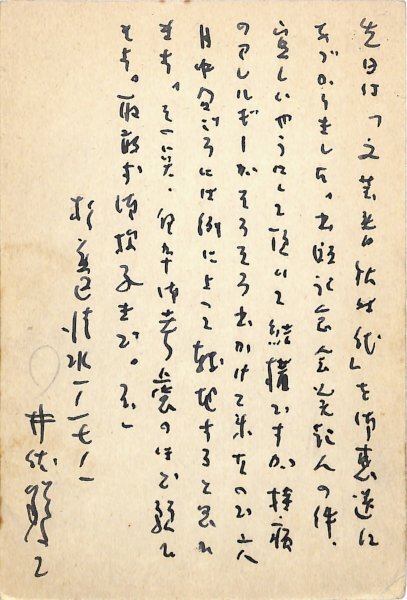 • 解説 山本初太郎宛 ペン書 9行 昭42・6・1(消印) 出版記念会発起人の依頼を受ける旨。「先日は『文芸春秋時代』を御恵送にあづかりました。出版記念会発起人の件、宜しいやうにして頂いて結構ですが持病のアレルギーがそろそろ出かけて来たので六月中旬ごろには例によつて転地すると思ひます。その点、何卆御考慮のほど願ひます」。(受信地)世田谷区野沢 #八木書店近代自筆物/3.葉書類 #94号近代文学特輯 code09226 ※自筆物につきましては、毎月25日前後に新蒐品を追加しております。PDF形式で御覧になりたい方は https://company.books-yagi.co.jp/archives/news/10928 を参照ください。