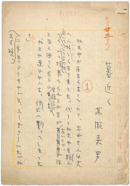 • 解説 『暮近く』 ペン書 200字詰原稿用紙18枚未完 用紙劣化 工場に徴用されて「ねえや」たちがいなくなった家庭の情景。子供たちは家事を手伝い、貯金を始める。冒頭に赤字で「物資愛護・貯蓄奨励童話集用第廿三号」とある。「日の丸部隊 建設童話」(金の星社・昭15)の原稿の一部。(種別)児童文学 #八木書店近代自筆物/1.草稿類 #94号近代文学特輯 code04321 ※自筆物につきましては、毎月25日前後に新蒐品を追加しております。PDF形式で御覧になりたい方は https://company.books-yagi.co.jp/archives/news/10928 を参照ください。