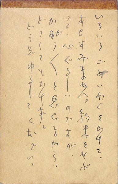 • 解説 北海道大学文武會新聞部宛 ペン書 6行 昭7・11・24(消印) 中折 テープ跡 原稿の断り。「いろいろごめいわくをかけて、あひすみません。約束をやぶつて、心ぐるしいのですが、かかう/\と思ひながら、どうしてもかけず。どうぞゆるしてください」。(発信地)鎌倉町名越谷戸(受信地)北海道大学 #八木書店近代自筆物/3.葉書類 #94号近代文学特輯 code09109 ※自筆物につきましては、毎月25日前後に新蒐品を追加しております。PDF形式で御覧になりたい方は https://company.books-yagi.co.jp/archives/news/10928 を参照ください。