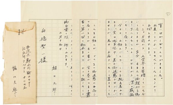 • 解説 舟橋聖一宛 ペン書 原稿用紙3枚27行 封筒付 昭11・2・13(消印) 「闘牛士」の書評を依頼。「『闘牛士』に関する御感想なり、読後感なりを幾枚でも結構ですから、文學界誌上にお書きいただき度いと思ふのであります。これは小生からのお願ひであると同時にまた第一書房の願望でもございます。どうぞ、まげておきき届け下さるやう、折入つてお願ひいたします」。(発信地)牛込区新小川町(受信地)淀橋区下落合 #八木書店近代自筆物/2.書簡類 #八木古書2025年4月新蒐 code09525 ※自筆物につきましては、毎月25日前後に新蒐品を追加しております。PDF形式で御覧になりたい方は https://company.books-yagi.co.jp/archives/news/10928 を参照ください。94号目録(R7.1)以後の追加は「#八木古書2025」で検索できます。