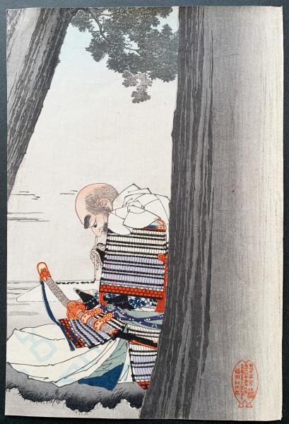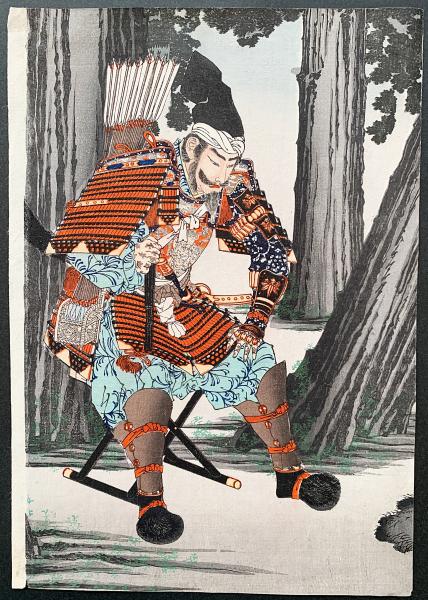 源平合戦の英雄である源義仲(木曾義仲)が戦勝を祈念して八幡宮に願書を奉納する場面を描いた本作「源義仲八幡宮願書之図」
