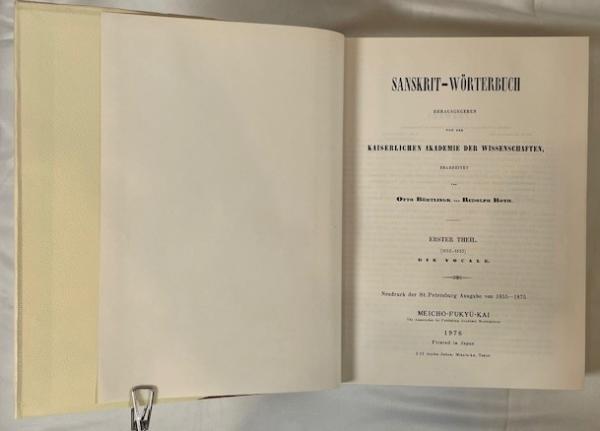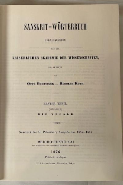 • 解説 This is the complete seven-volume set of the monumental Sanskrit-Wörterbuch by Otto Böhtlingk and Rudolph Roth, often called the “Great St. Petersburg Dictionary.” This 1976 Japanese facsimile edition, published by Meicho-Fukyu-Kai, faithfully reproduces the original St. Petersburg Academy of Sciences edition (1855–1875). It remains one of the most comprehensive Sanskrit–German dictionaries ever produced and is indispensable for advanced study in Indology, Vedic literature, and comparative linguistics. The set is in very good condition, with clean text blocks, tight bindings, and minor age-related foxing on top edges. Several volumes remain in original protective wrapping, reflecting minimal use.