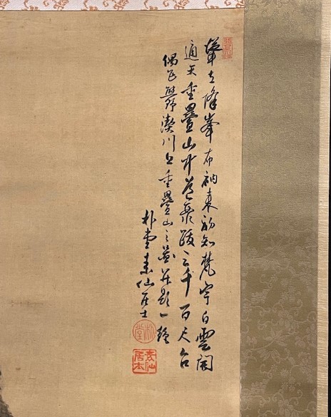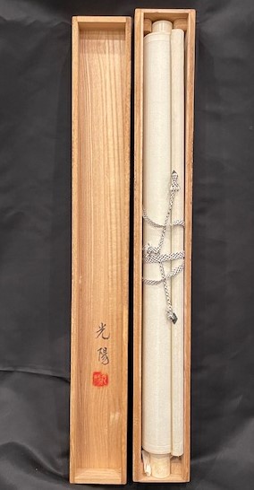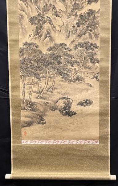 • 解説 昭和初期(1930年・庚午)頃の作と推定される格式高い山水画掛軸。絹本に水墨淡彩で、霧に包まれた高山、松林、静かな渓谷を繊細かつ力強く描写しています。署名は「朴堂 李」。文人画(南画)の正統的美意識が感じられ、前景の松と岩、中景の橋、遠景の雲山による「高士隠遁」の伝統構図が特徴です。行草体の漢詩が画格を高め、共箱には「光陽」の書付。経年のシミやヤケはありますが致命的損傷はなく、侘び寂びを楽しめる一幅です。