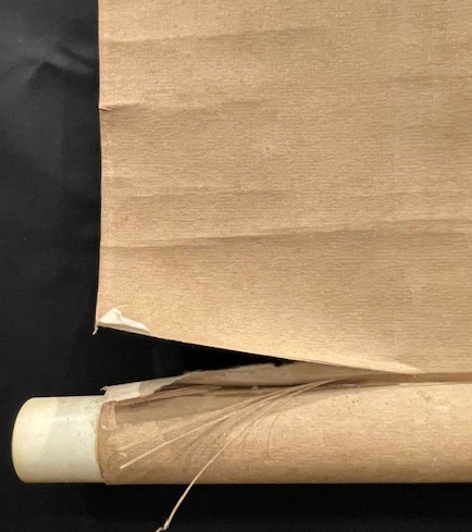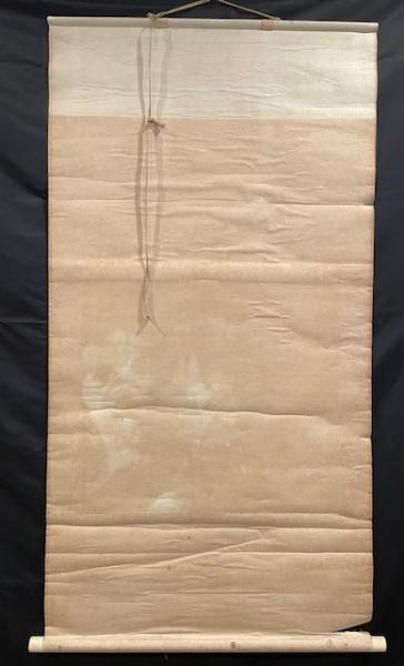 • 解説 日本の山村風景を描いた水墨山水画の掛軸ですが、経年劣化と破損が著しいため難あり品(ジャンク)として出品します。茅葺屋根の家や木立が描かれたのどかな作品です。状態はGrade Dで、下部の軸棒付近に致命的な裂けがあり、現状では展示不可。全体に強いヤケや折れジワが見られ、軸先は樹脂製です。サイズは約125×74cmの幅広短尺。表具修復の練習用、和紙のリメイク素材、古民家風ディスプレイなどにおすすめします。付属品はありません。