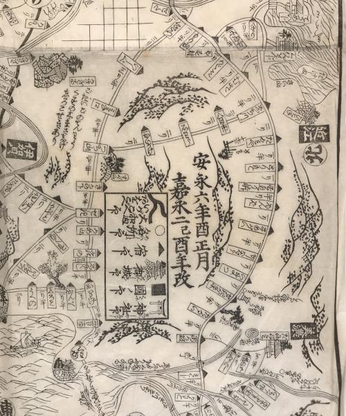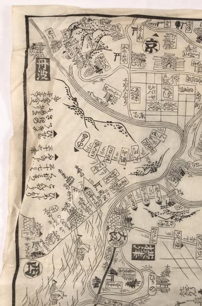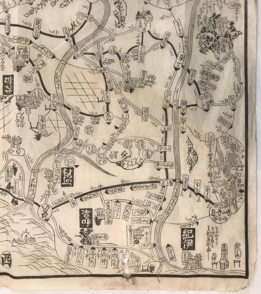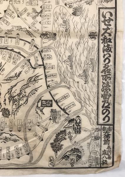 • 解説 江戸時代後期、嘉永2年(1849年)に改訂出版された木版画の道中図「いせ大和めぐり道法独案内」です。お伊勢参りや奈良巡礼用の携帯地図で、京都・大阪から伊勢神宮や二見浦、奈良の長谷寺・吉野・多武峰までの道順と距離を詳細に記載。安永6年初版から70年以上経て幕末期に改訂されたロングセラーです。墨摺り木版画、約50×48cm。状態Bで全体にヤケや折れ、端の微細な切れやシミがあります。江戸期の旅を伝える史料として、額装や資料用に適しています。