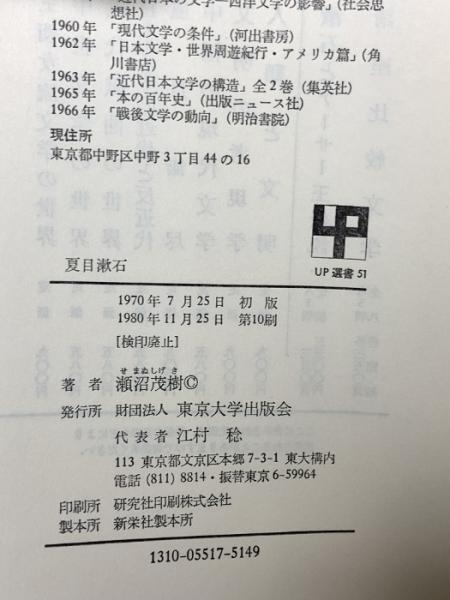 夏目漱石 (UP選書 51) 東京大学出版会 瀬沼 茂樹