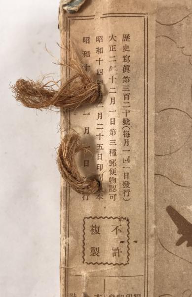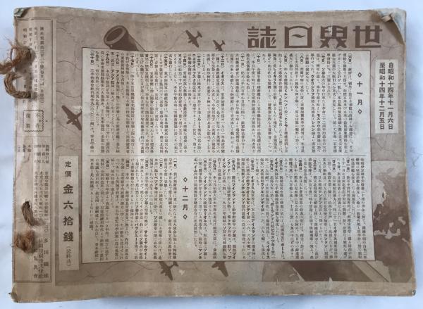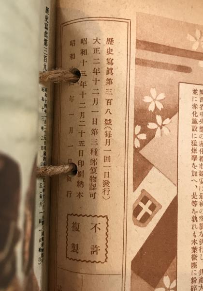 • 解説 表紙は「第308号 昭和14年新年号(皇軍大陸進撃号)」、奥付には「第320号(昭和14年12月発行)」が確認でき、昭和14年(1939年)ほぼ1年分の『歴史写真(歴史寫眞)』を麻紐で合本したものと思われます。日中戦争下の大陸での日本軍の作戦、兵士の生活、銃後の国内情勢を多数の写真で記録。状態Cで、合本、破れ、折れ、強いヤケあり。通読可能。挟み込み付録として『讀賣戰世』(昭和14年11月)を含みます。昭和史・軍事史研究向けの貴重資料です。