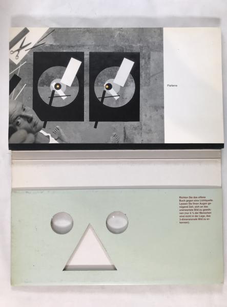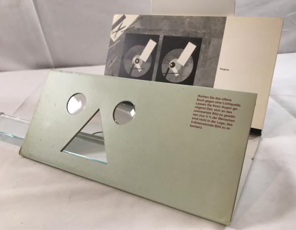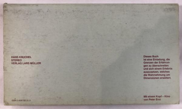 • 解説 A rare first edition of STEREO by Swiss photographer and designer Hans Knuchel, published in 1990 by Verlag Lars Müller. This interactive artist book explores stereoscopic vision through high-contrast, geometric, experimental photography designed for 3D viewing. It includes the original custom cardboard viewer (Kopf-Kino / Head-Cinema by Peter Erni), enabling the intended optical effects. Details: Softcover with die-cut cover; German text; ISBN 3-906700-31-3. Condition: Grade A- (Very Good). Minor shelf wear and light age-toning to the cover; interior clean with no markings; viewer present and in excellent condition.