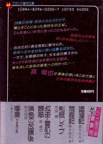 • 解説 1988年8月10日発行/第1刷/帯付●成人小説(グラビアなし)●※古い文庫ですので多少の経年劣化はご理解くださいませ。※この商品は成人向け商品です。18歳以上の方のみご購入できます。※掲載品、通販商品は全て店頭・他サイト販売と併用です。売り切れの際はキャンセル処理とさせていただきますので、御了承ください。