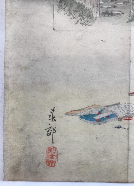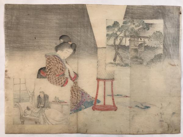 • 解説 「明治の広重」とも称される小林清親による珍しい木版画です。頬に手を当てる日本髪の女性と、インセットの西洋医による聴診器の診察が対比され、伝統美人画と近代医療風景が共存するユーモアあふれる作品です。明治時代(1880–90年代)、木版、大判サイズ。署名「清親」、印「小林」。状態Cで虫食い穴、経年のヤケ・シミ、中央折れがあります。美人画とは異なる風刺性と文明開化期の医療風俗を伝える貴重な一枚で、コレクションや研究資料に最適です。