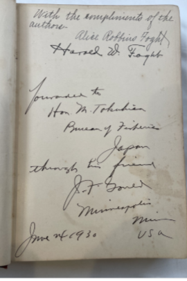 • 解説 A rare signed and inscribed association copy of Unfathomed Japan: A Travel Tale in the Highways and Byways of Japan and Formosa, published by Macmillan, 1928. The front flyleaf bears a notable inscription: “With the compliments of the authors Harold & Alice Foght. To Hon. M. Tokuhisa, Bureau of Fisheries, Japan June 24, 1930,” documenting a personal gift to a Japanese government official and establishing strong historical provenance. The book records the Foghts’ travels in 1920s Japan and Formosa (Taiwan) and is richly illustrated with period photographs, including scenes from Taiwan and Japan. Condition: Very Good clean, lightly age-toned pages, firm binding, and clear, legible signatures.